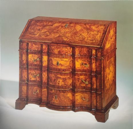 Secrétaire à abattant plaqué en loupe de noyer avec des cadres et des formes en bois. À l'intérieur, un ensemble de petits tiroirs et de compartiments à documents.
